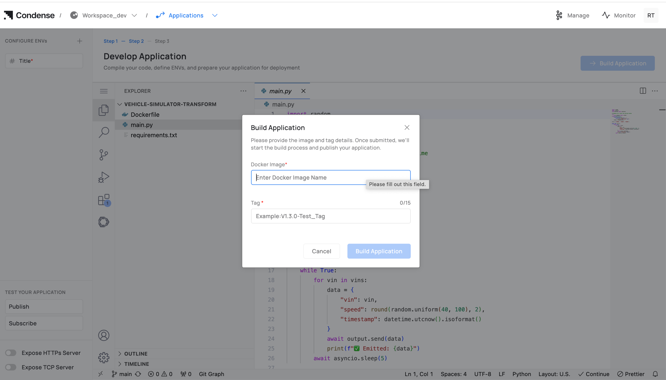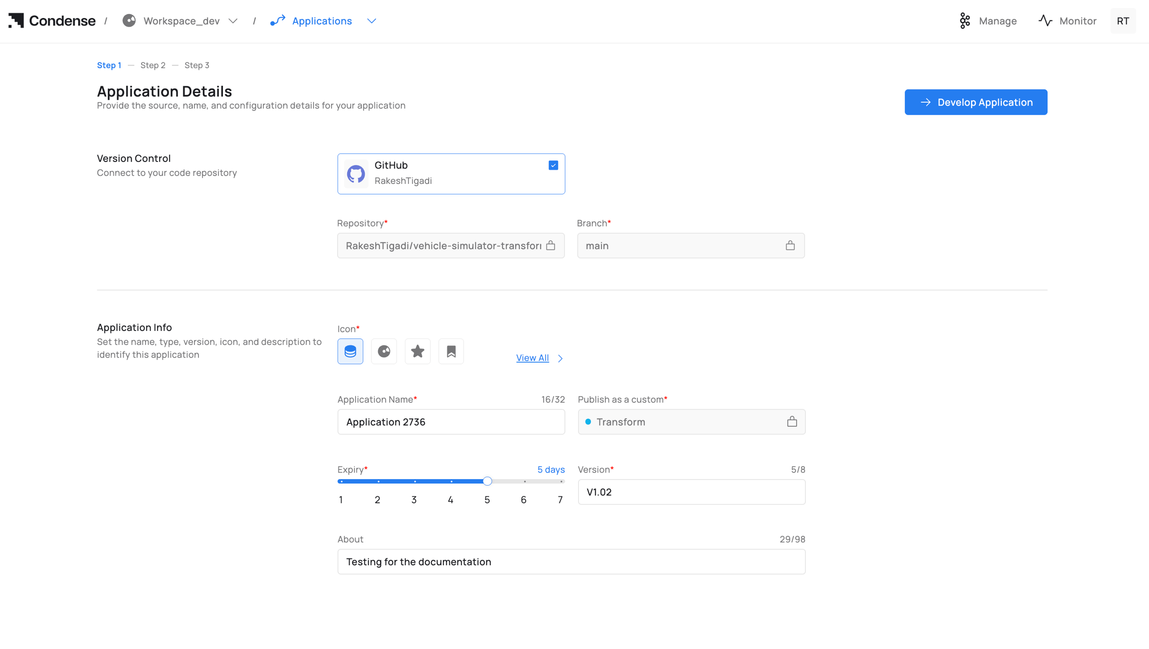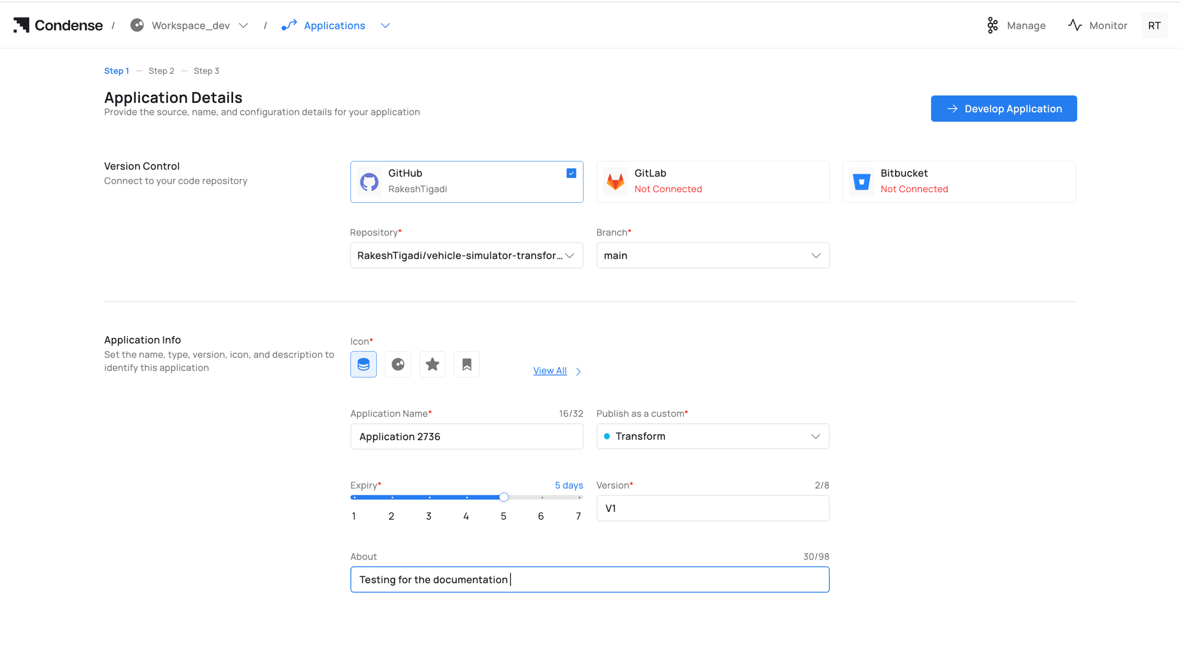 Starting the development of an application involves completing all required steps to build and publish it. After publication, the application appears in the Transforms or Connectors section, and when deploying a transform or connector in a pipeline, you will be prompted to select the desired version to deploy.