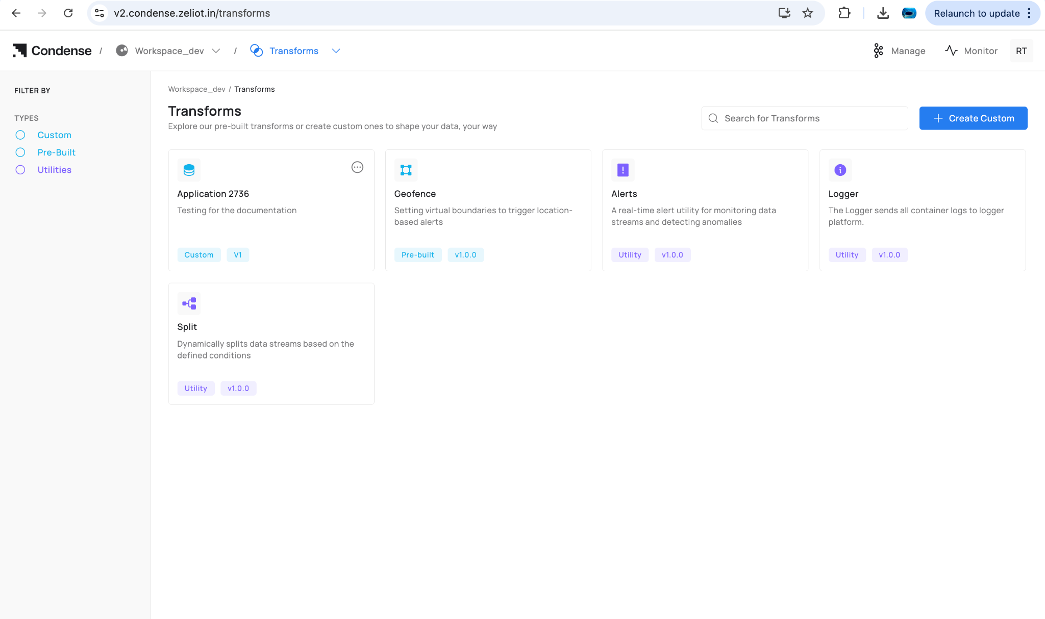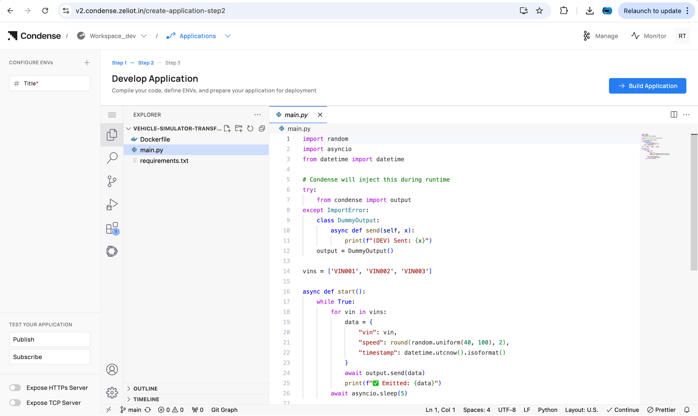An Application in Condense is a custom, code‑based unit developed in the built‑in IDE and version‑controlled through Git. Once built and published, an application becomes deployable as a Custom Transform or a Custom Connector (Input or Output) within a workspace pipeline.