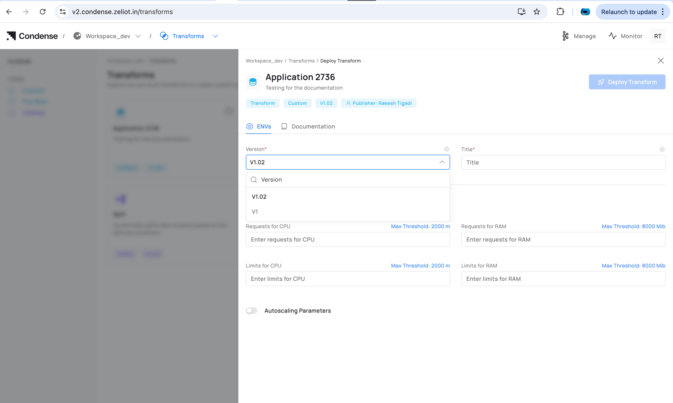 Transforms: pipeline editor → Add Transform → Custom → choose app/version → configure ENVs/parameters → Deploy.