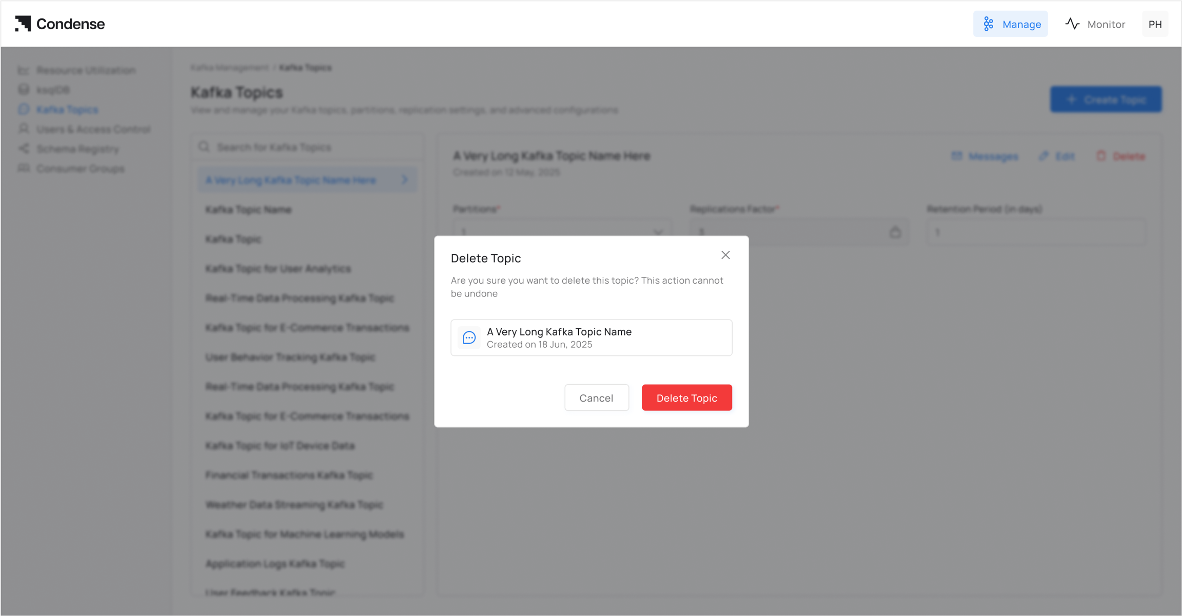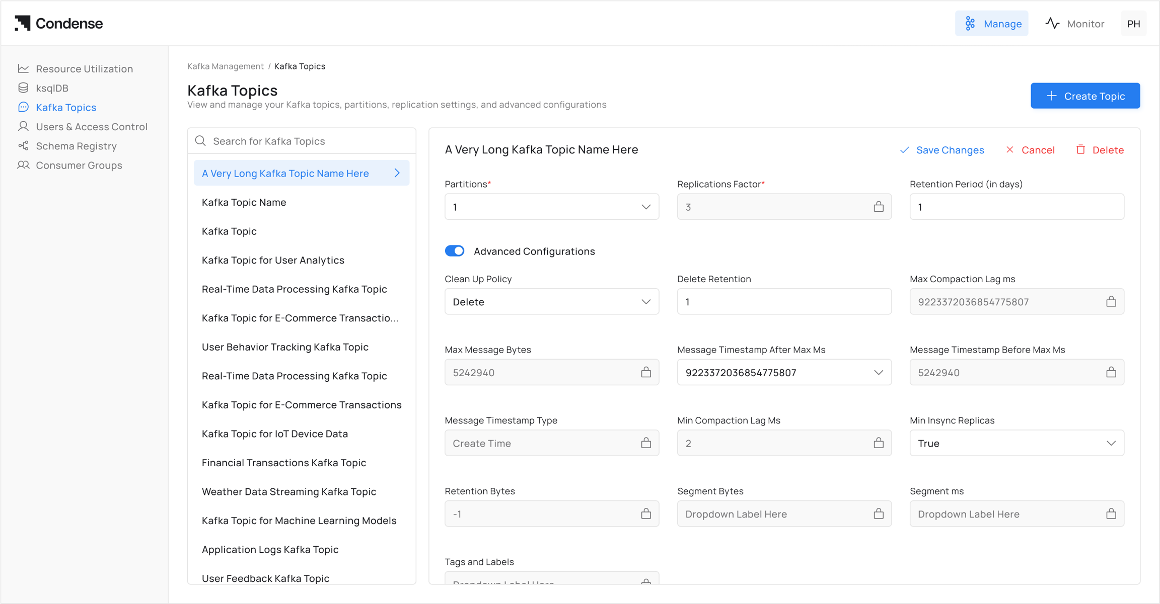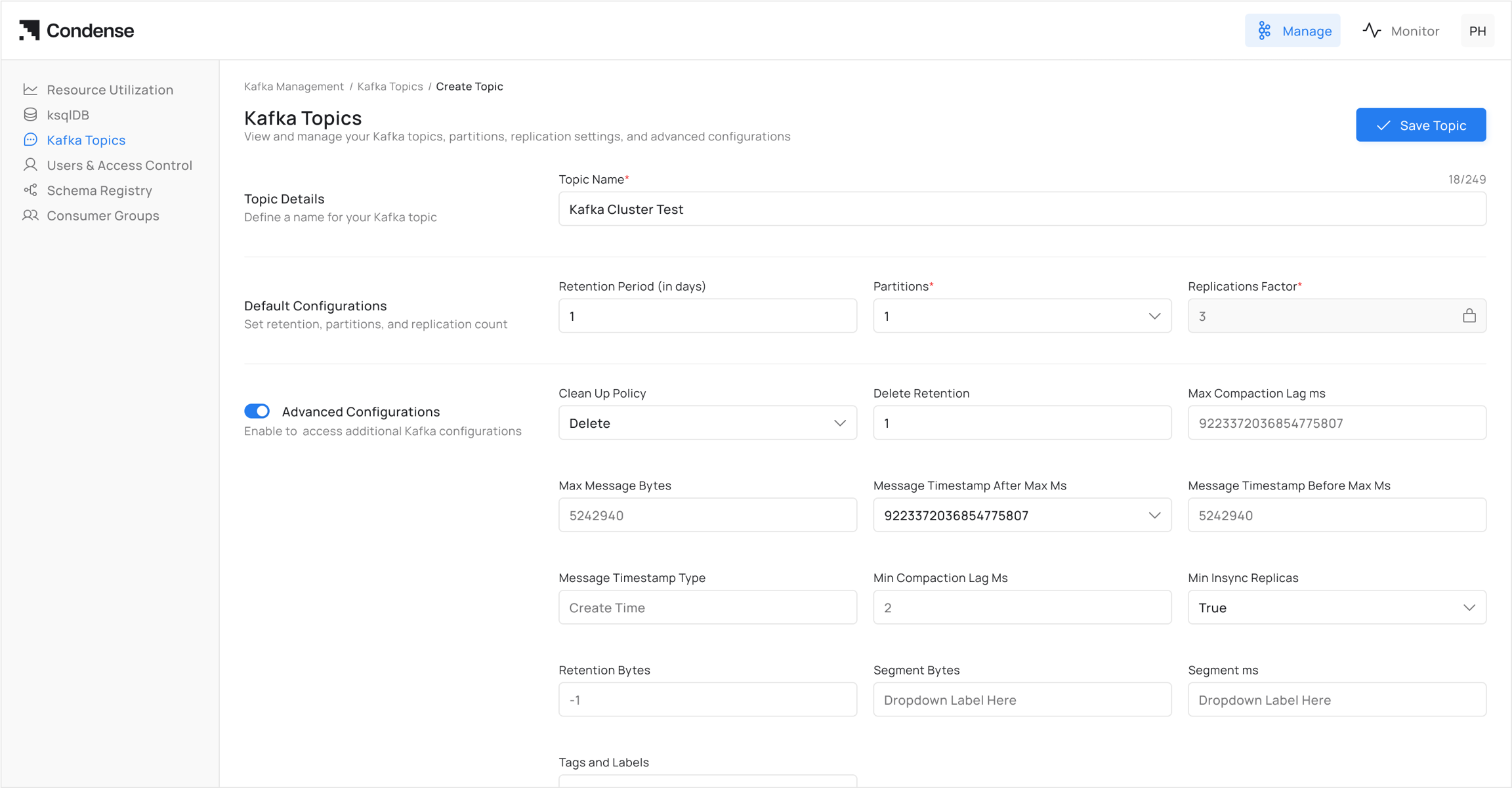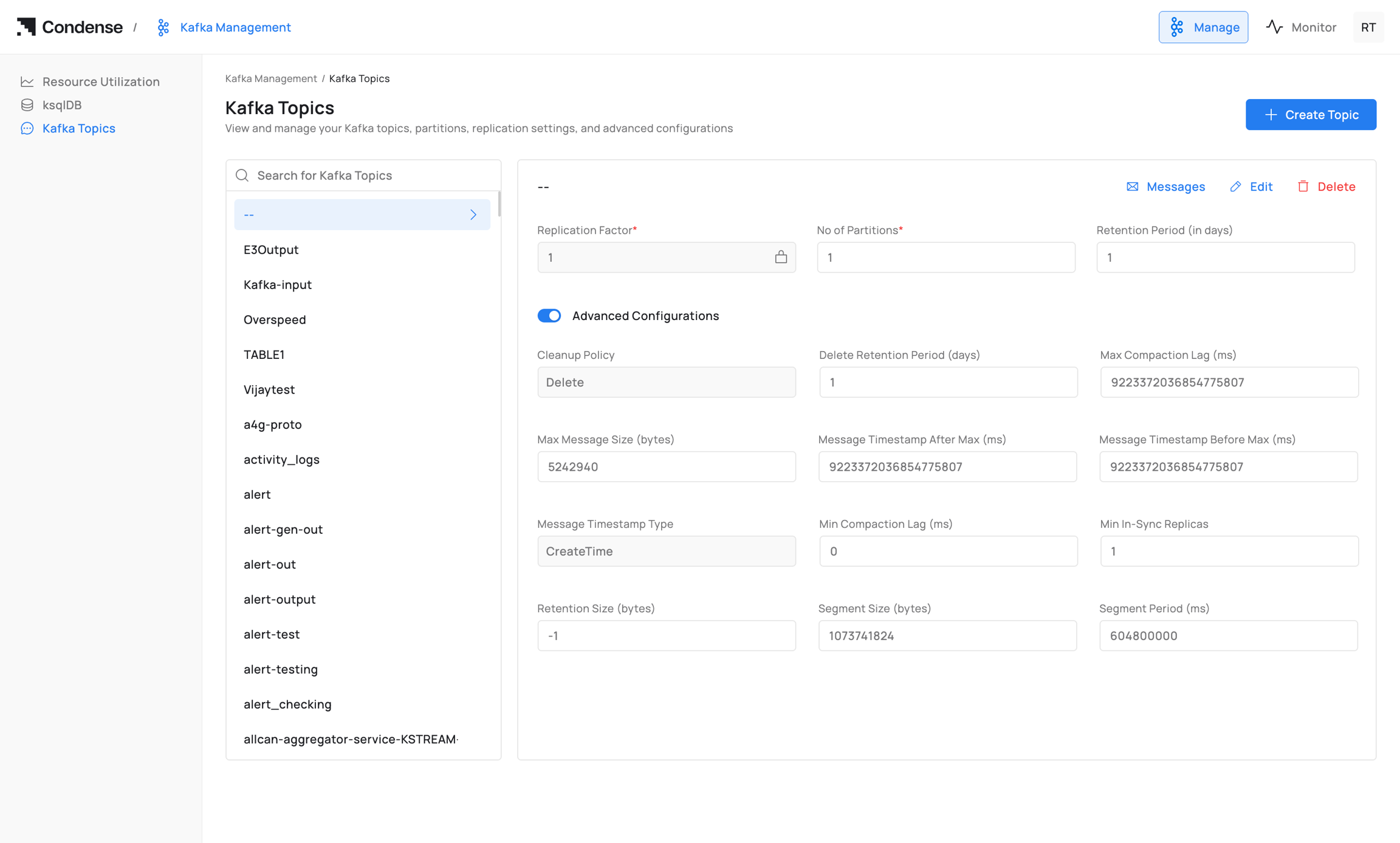 The Kafka Topics page in Condense provides a management interface to view, create, and configure topics within a Kafka cluster. From this page, administrators can define replication and partitioning, adjust retention policies, and apply advanced topic-level settings without requiring direct Kafka CLI commands.