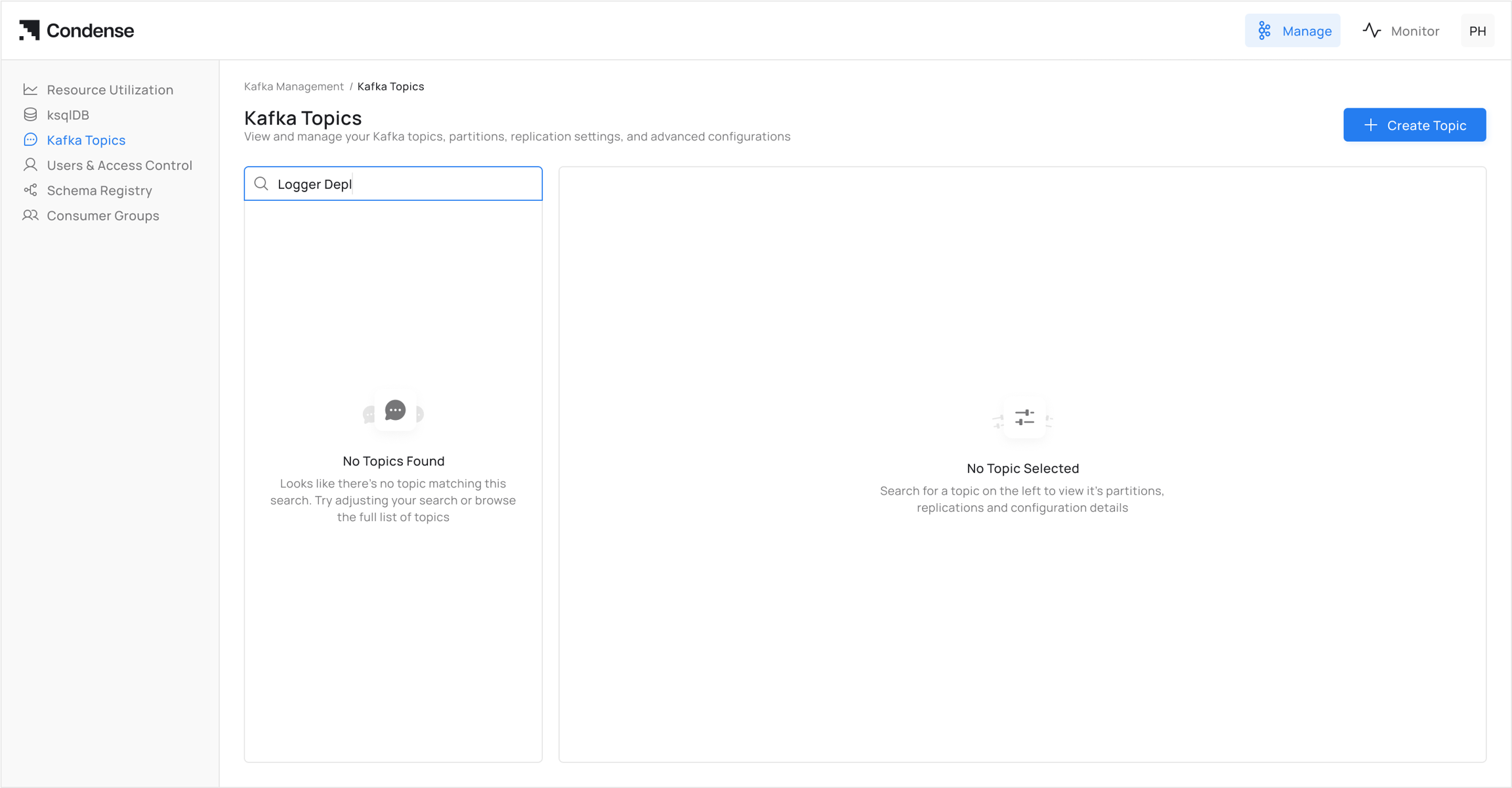 On the left-hand panel, Condense displays all existing topics in the connected Kafka cluster.