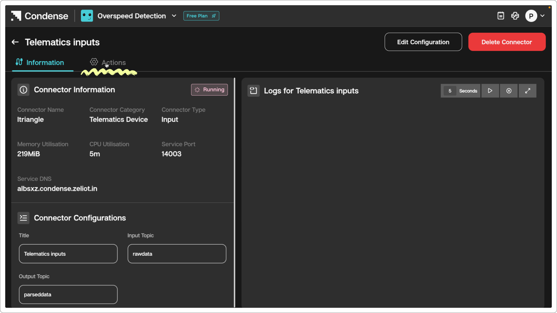 Click on the Telematics device type connector card and click on the Actions tab.